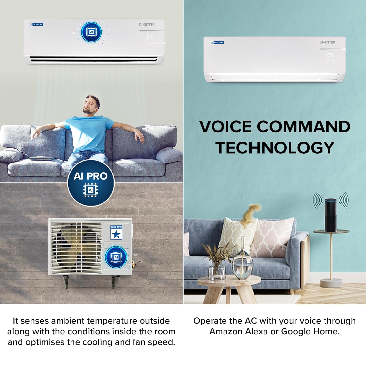 Blue Star 1.5 Ton 3 Star, Wi-Fi Smart Inverter Split AC (Copper, 5 in 1 Convertible Cooling, 4-Way Swing, Turbo Cool, Voice Command, IC318YNUS, White)