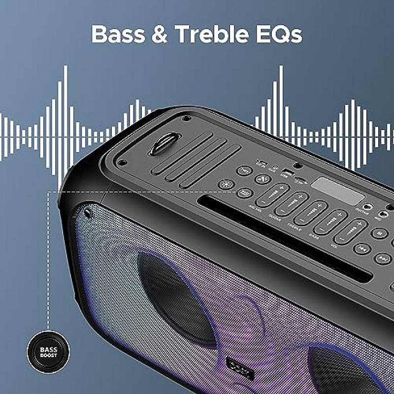 - Bass and Treble Controls: Effortlessly alter the audio settings using the bass and treble controls of this speaker and experience the ultimate audio enjoyment. Each beat and rhythm gets amplified to your liking for an unmatchable combo of comfort and fun.