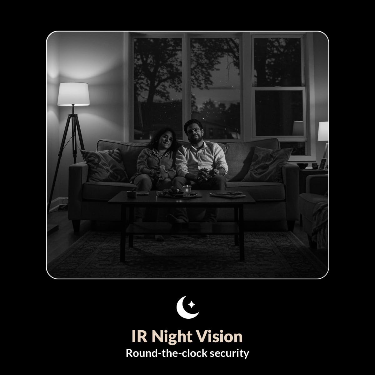 • IR Night Vision up to 15m – Infrared LEDs capture clear black-and-white video even in complete darkness, ensuring your Wi-Fi camera for home is effective 24×7.
