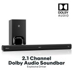 • 2.1-Channel Configuration — Includes a soundbar with multiple drivers and a 6.5″ wired subwoofer for deeper bass and enhanced audio depth.