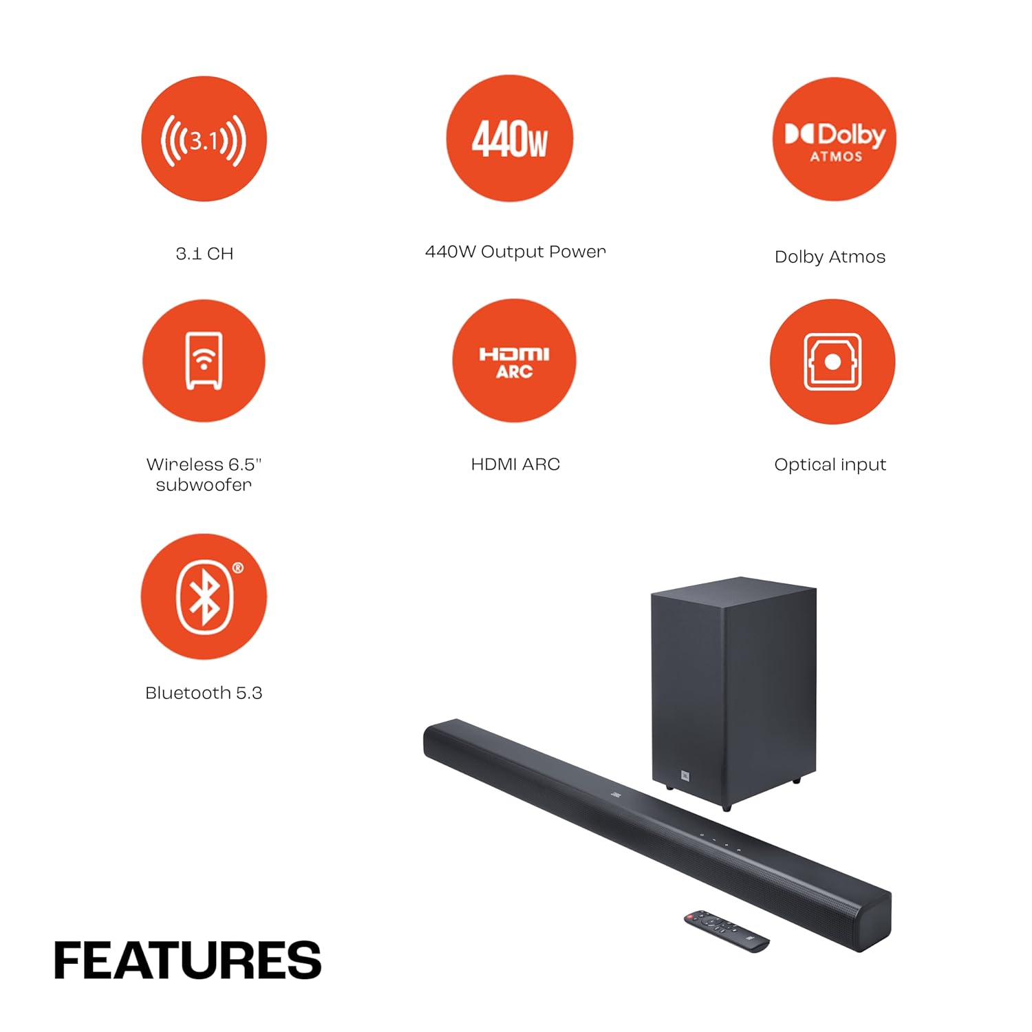 JBL Cinema SB590 Deep Bass, Dolby Atmos Soundbar with Wireless Subwoofer for Extra Deep Bass, 3.1 Channel, Center channel for superior voice clarity, HDMI eARC, Bluetooth & Optical Connectivity (440W)