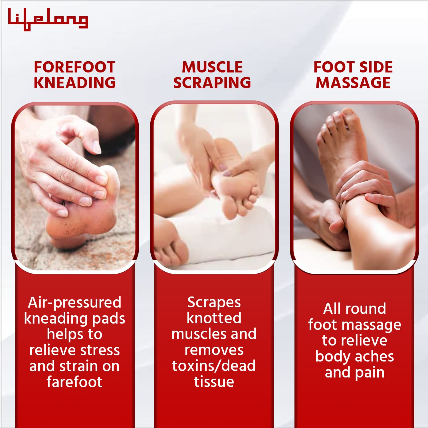 Relieve aching feet and enhance blood circulation with our integrated heating system, providing gentle warmth up to 60 degrees. Our foot massager offers various techniques such as plantar scraping, instep kneading, calf kneading, and calf scraping, targeting your calves, ankles, soles, and feet for a complete massage experience.