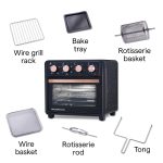 - Accessories – Baking tray, Wire basket, Rotisserie rod, Wire grill rack, Rotisserie basket, Crumb tray, Tong