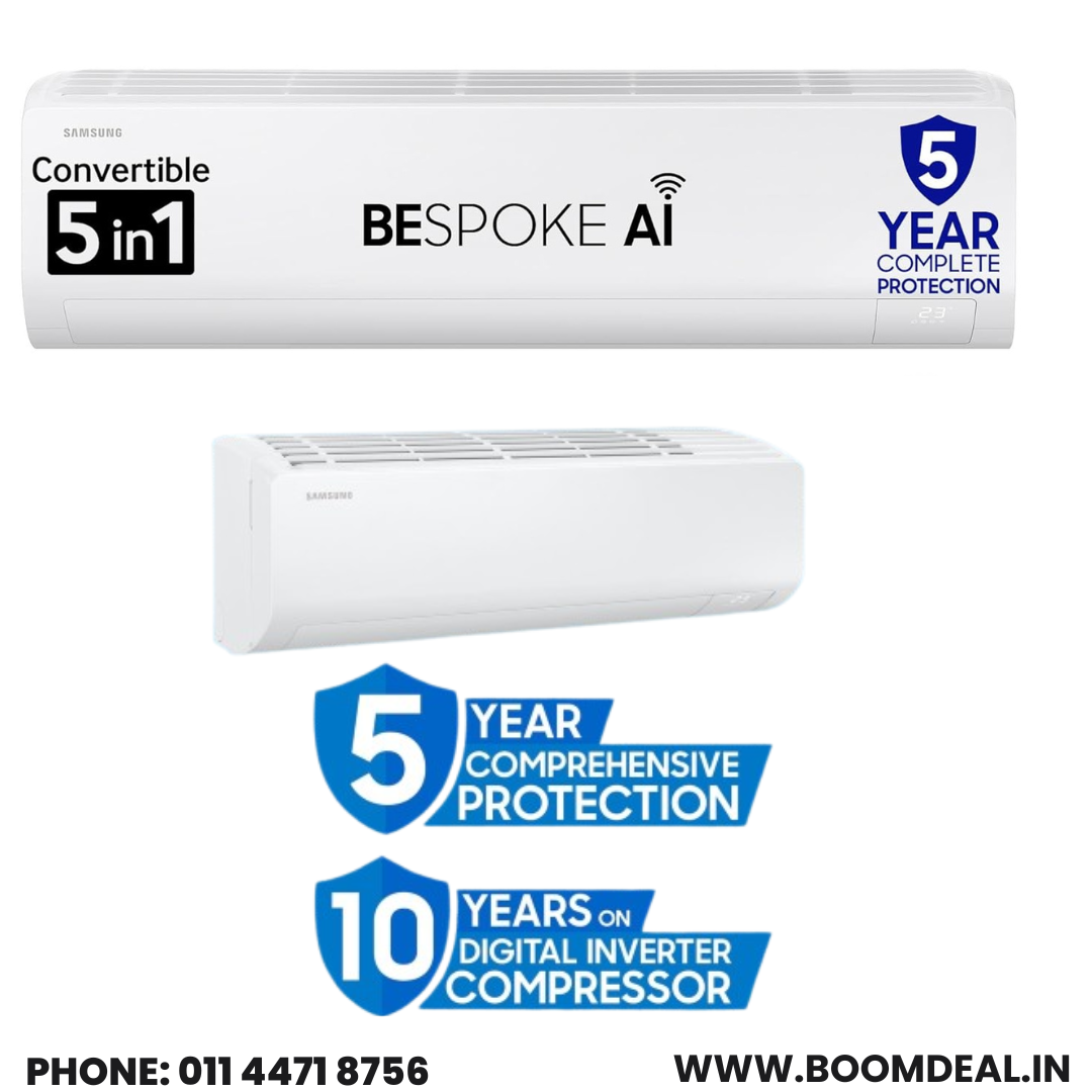 • Warranty: 5 years comprehensiveSamsung Bespoke AI ACSamsung AI Energy modeSamsung 43% Faster CoolingSamsung 5 Step Convertible ModesSamsung Durable & Anti-Corrosion