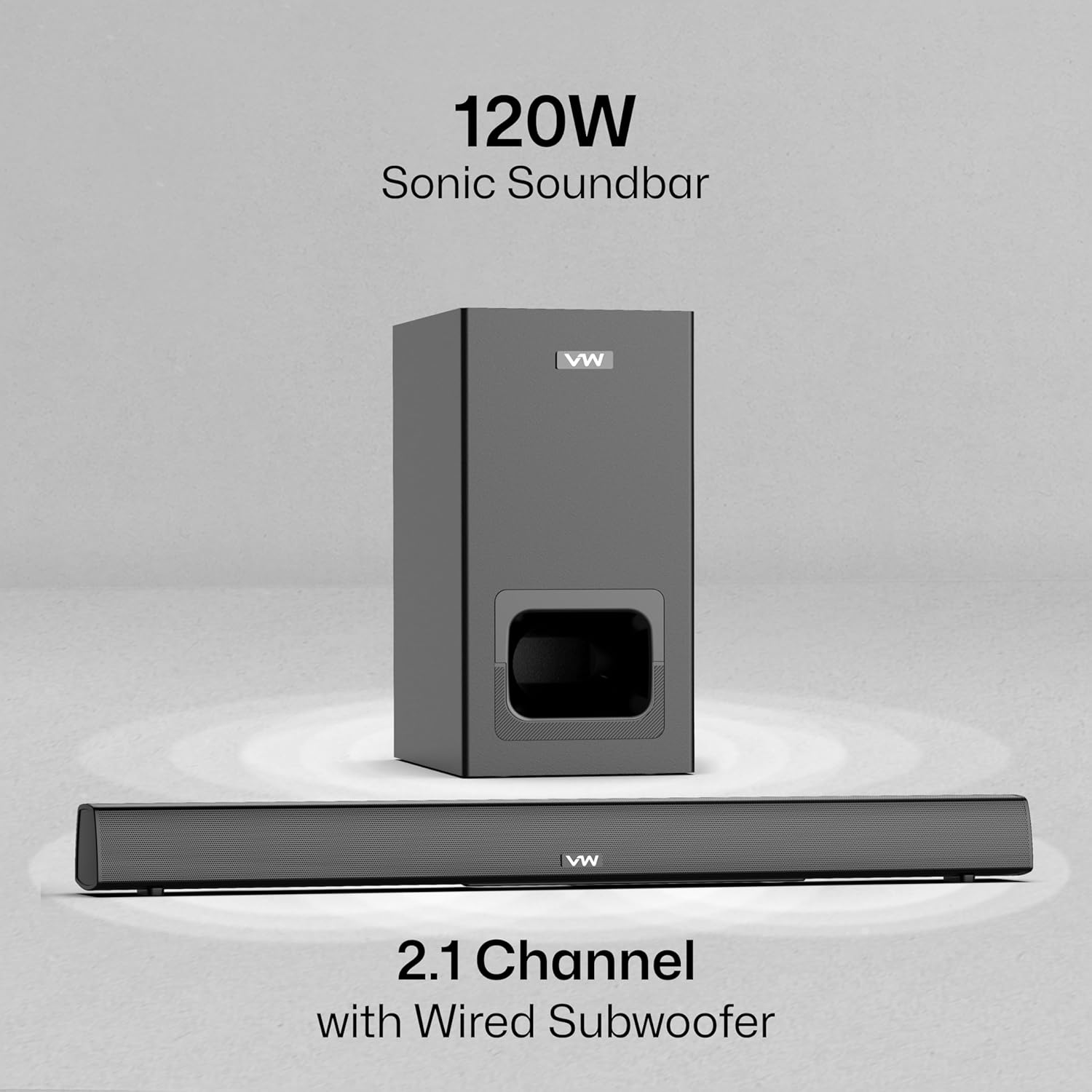VW Sonic Bar | 120W Soundbar | 2.1 Channel Home Theatre | 5.25” Wired Subwoofer | Multiple Connectivity & Sleek Design (Black)